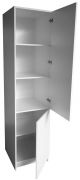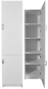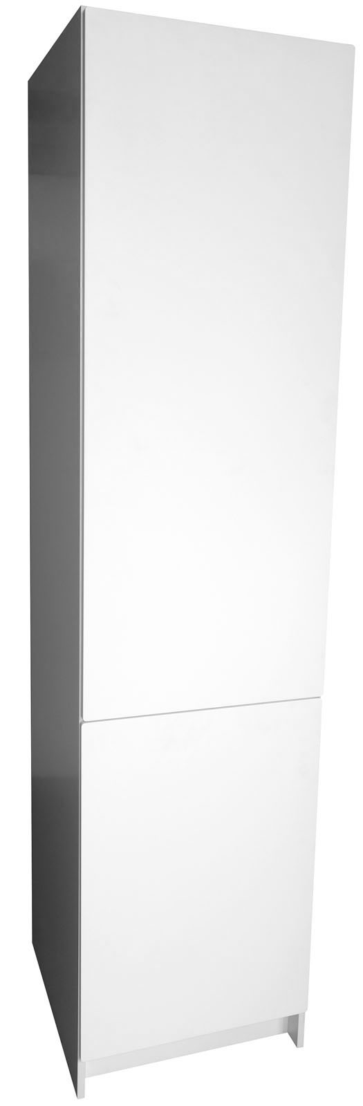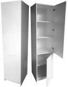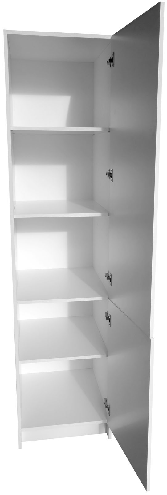 Potravinová skříň do kuchyně má včetně pevného soklu (10cm) výšku 206 cm. Hloubka korpusu je 56 cm a i s dvířky nepřesáhne celková hloubka skříňky 58 cm. Díky tomu není za skříňkou žádný prostor pro vedení vody, plynu apod.. Skříň je s jednodveřovým otvíráním a celkem má pět pater polic jako úložný prostor. K dvířkům je zdarma úchytka Diana. Tvar dvířek je rovný-hladký, barva dvířek a korpusu je bílá.