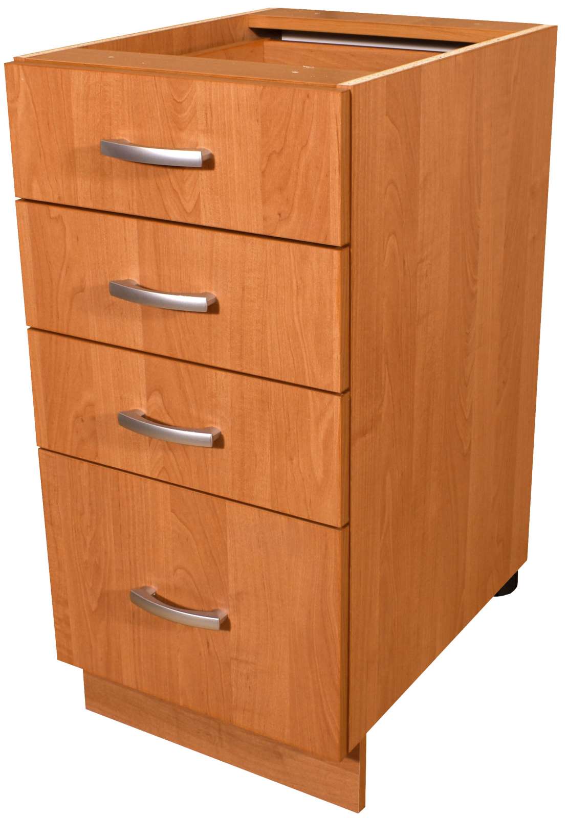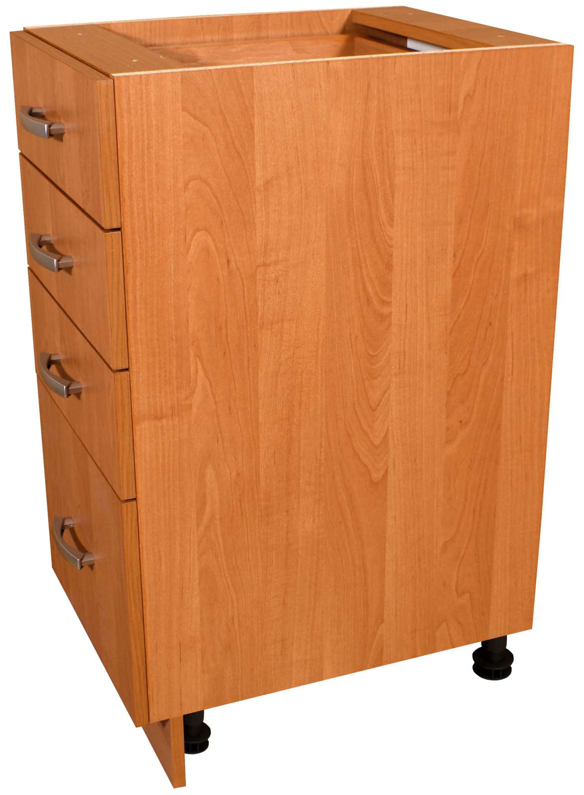 Spodní kuchyňská skříňka má výšku 82 cm včetně 10 cm vysokých rektifikačních nožiček. Hloubka korpusu je 50 cm a i se šuplíky nepřesáhne celková hloubka skříňky 52 cm. Díky tomu za skříňkami vzniká prostor cca 6 cm pro vedení vody, plynu apod. Z horní části není zakrytá.