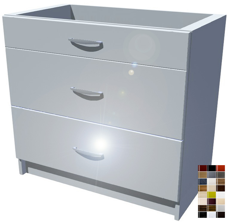 90 cm široká skříňka stojí na pevném soklu vysokém 10 cm. Celková výška i se soklem je 82 cm. Hloubka korpusu je 52 cm a i s čely šuplíků nepřesáhne celková hloubka skříňky 54 cm. Díky tomu za skříňkou vzniká prostor cca 4 cm pro vedení vody, plynu, zásuvek apod. Vršek skříňky je otevřený, jsou zde umístěny pouze příčky k uchycení pracovní desky. Zásuvky mají pevné dno z lamina s nosností až 30 kg. U šuplíků je použitý mechanizmus zavírání s pomalým dojezdem.