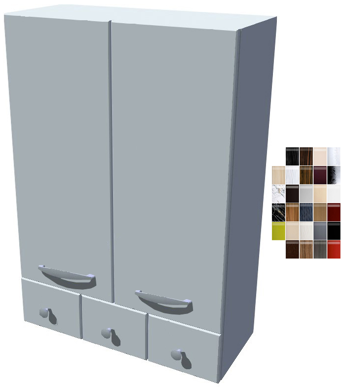 60 cm široká skříňka je dvojdveřová, vysoká 86 cm. Ve spodní části jsou tři šuplíčky. Hloubka korpusu je 30 cm a i s dvířky nepřesáhne celková hloubka skříňky 32 cm. Uvnitř skříňky jsou dvě police. Skříňka má nastavitelné úchyty pro upevnění na závěsné liště.