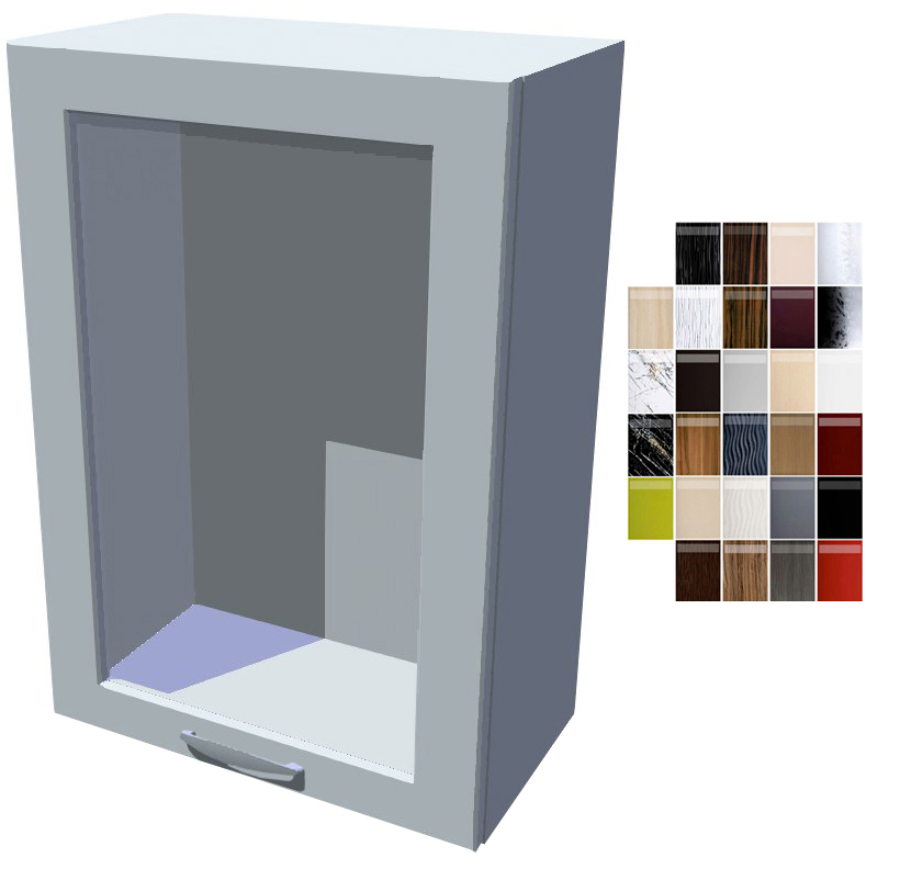 50 cm široká skříňka je jednodveřová, vysoká 72 cm. Hloubka korpusu je 30 cm a i s dvířky nepřesáhne celková hloubka skříňky 32 cm. Uvnitř skříňky je jedna skleněná police. Skříňka má nastavitelné úchyty pro upevnění na závěsné liště.