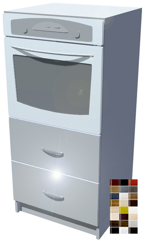 60 cm široká skříňka je na pevném soklu vysokém 10 cm. Celková výška i se soklem je 128 cm. Hloubka skříňky je 47 cm, ale s troubou je hluboká až na zeď. Za skříňkou v prostoru trouby tedy již není žádný prostor pro vedení vody, plynu nebo pro elektrické zásuvky apod. V dolní části jsou dva šuplíky s kovovými ložiskovými plnovýsuvy. Skříňka není nahoře zakrytá, má jen příčky k uchycení pracovní desky.