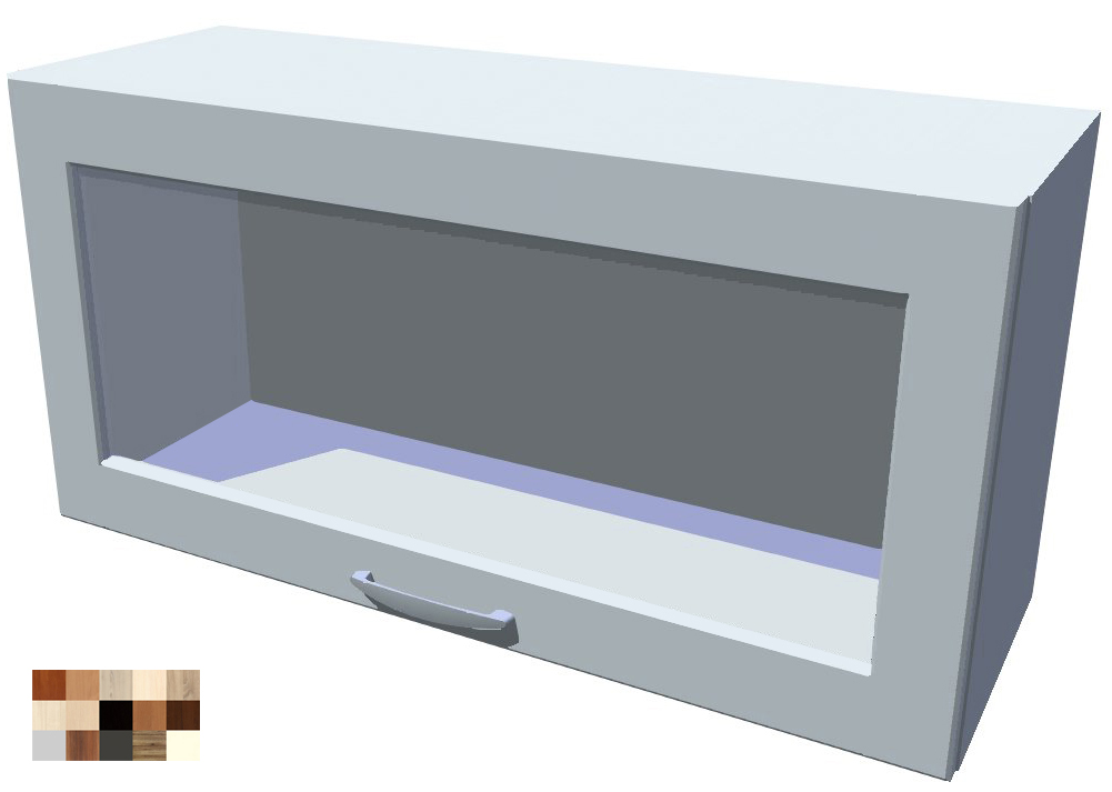 80 cm široká a 40 cm vysoká skříňka má jeden výklop se skleněnou vitrínou. Hloubka korpusu je 30 cm a i s dvířky nepřesáhne celková hloubka skříňky 32 cm. Skříňka je bez police, obsahuje mechanizmus k zavěšení na závěsnou lištu.