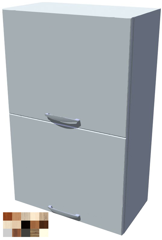 50 cm široká skříňka má dva výklopy. Skříňku dodávám ve dvou provedeních - s výškou 72 cm nebo 80 cm. Hloubka korpusu je 30 cm a i s dvířky nepřesáhne celková hloubka skříňky 32 cm. Skříňka je bez polic, obsahuje mechanizmus k zavěšení na závěsnou lištu.