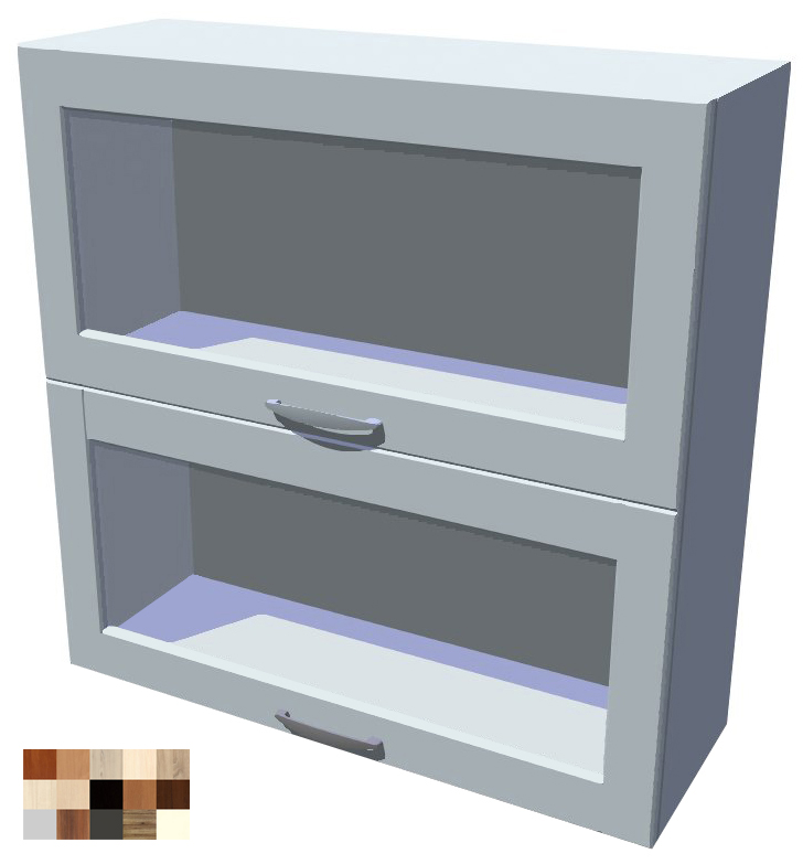 80 cm široká skříňka má dva výklopy. Skříňku dodávám ve dvou provedeních - s výškou 72 cm nebo 80 cm. Hloubka korpusu je 30 cm a i s dvířky nepřesáhne celková hloubka skříňky 32 cm. Skříňka je bez polic, obsahuje mechanizmus k zavěšení na závěsnou lištu.