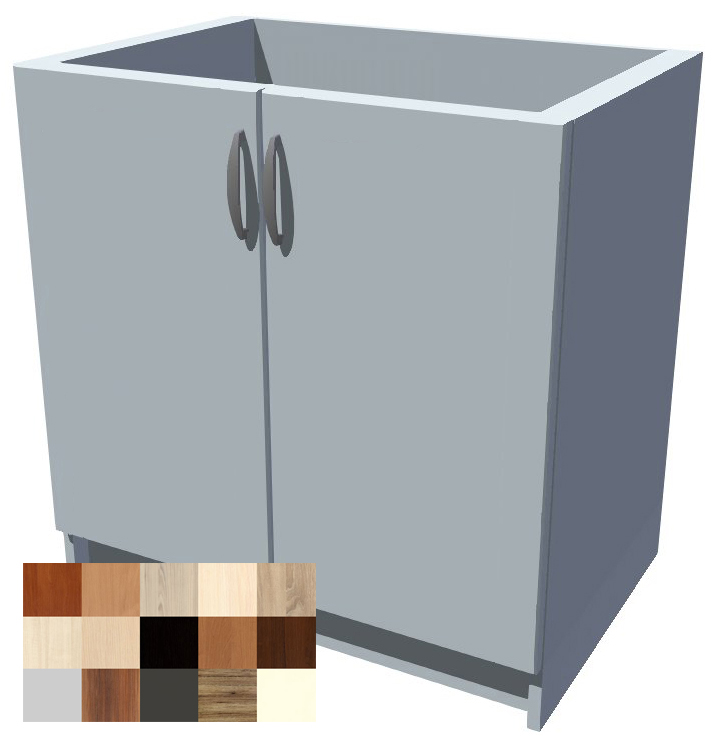 80 cm široká skříňka je dvojdveřová, na pevném soklu vysokém 10 cm. Celková výška i se soklem je 82 cm. Hloubka korpusu je 50 cm a i s dvířky nepřesáhne celková hloubka skříňky 52 cm. Díky tomu za skříňkou vzniká prostor cca 6 cm pro vedení vody, plynu, zásuvek apod. Skříňka je bez police. Vršek skříňky je otevřený, uzpůsobený pro uchycení dřezu.