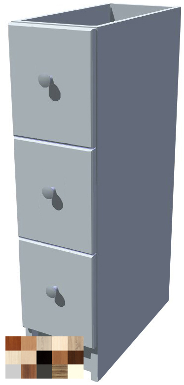 20 cm široká skříňka stojí na pevném soklu vysokém 10 cm. Celková výška i se soklem je 82 cm. Hloubka korpusu je 50 cm a i s čely šuplíků nepřesáhne celková hloubka skříňky 52 cm. Díky tomu za skříňkou vzniká prostor cca 6 cm pro vedení vody, plynu, zásuvek apod. Vršek skříňky je otevřený, jsou zde umístěny pouze příčky k uchycení pracovní desky. Skříňka má tři zásuvky na prostých pojezdech.
