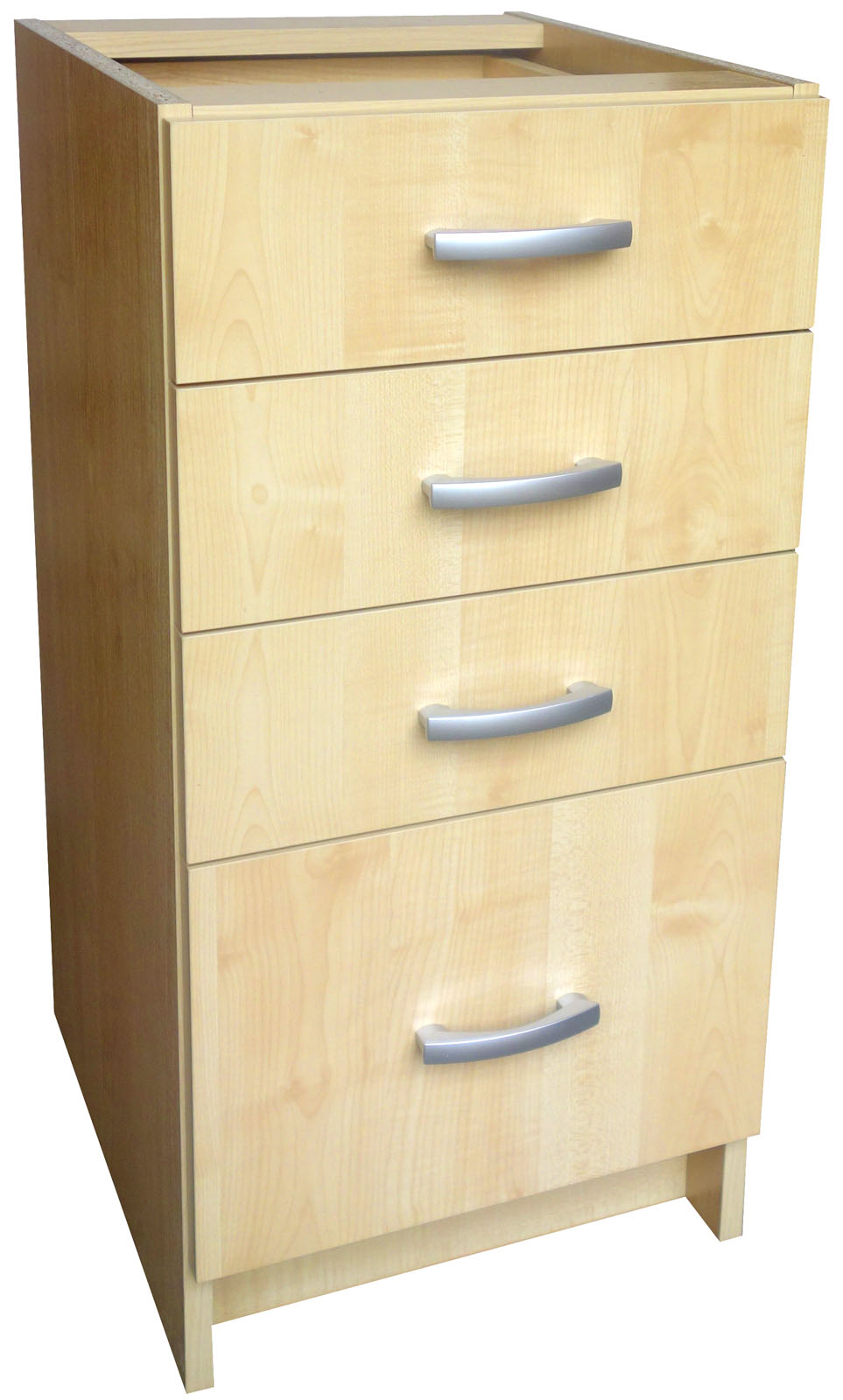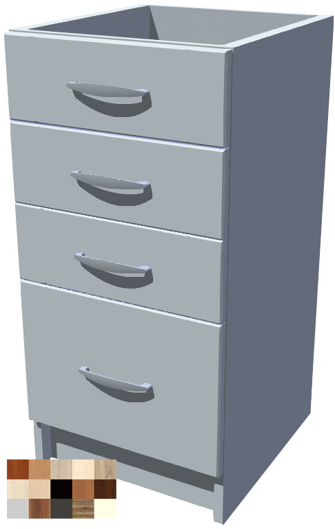 40 cm široká skříňka stojí na pevném soklu vysokém 10 cm. Celková výška i se soklem je 82 cm. Hloubka korpusu je 50 cm a i s čely šuplíků nepřesáhne celková hloubka skříňky 52 cm. Díky tomu za skříňkou vzniká prostor cca 6 cm pro vedení vody, plynu, zásuvek apod. Vršek skříňky je otevřený, jsou zde umístěny pouze příčky k uchycení pracovní desky.