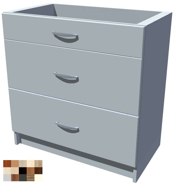 80 cm široká skříňka stojí na pevném soklu vysokém 10 cm. Celková výška i se soklem je 82 cm. Hloubka korpusu je 50 cm a i s čely šuplíků nepřesáhne celková hloubka skříňky 52 cm. Díky tomu za skříňkou vzniká prostor cca 6 cm pro vedení vody, plynu, zásuvek apod. Vršek skříňky je otevřený, jsou zde umístěny pouze příčky k uchycení pracovní desky.
