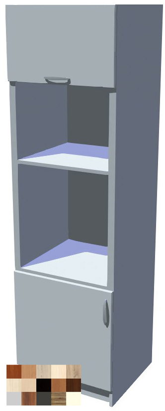 60 cm široká skříňka je na pevném soklu vysokém 10 cm. Celková výška i se soklem je 206 cm. Hloubka korpusu je 56 cm a i s dvířky nepřesáhne celková hloubka skříňky 58 cm. Za skříňkou již není žádný prostor pro vedení vody, plynu, elektrické zásuvky apod.
