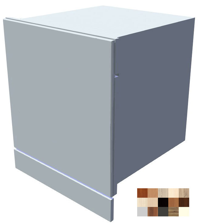 Vestavná myčka nemá žádnou vlastní skříňku. Umístí se v kuchyňské lince mezi ostatní skříňky a pouze zepředu se na čelo myčky přišroubují námi vyrobená dvířka. Dvířka jsou potom v barvě jako dvířka ostatních skříněk v lince. Myčku kryje ještě zepředu dolní sokl, který přidáváme k objednávce zdarma. Barvu soklu určuje barva korpusů skříněk z objednávky. Případně barvu připište do poznámky k objednávce. Také si můžete objednat plastový sokl.