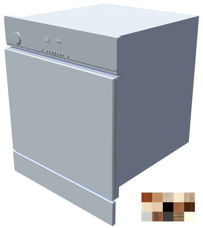 Vestavná myčka nemá žádnou vlastní skříňku. Umístí se v kuchyňské lince mezi ostatní skříňky a pouze zepředu se na čelo myčky přišroubují námi vyrobená dvířka. Dvířka jsou potom v barvě jako dvířka ostatních skříněk v lince. Myčku kryje ještě zepředu dolní sokl, který přidáváme k objednávce zdarma. Barvu soklu určuje barva korpusů skříněk z objednávky. Případně barvu připište do poznámky k objednávce. Také si můžete objednat plastový sokl.