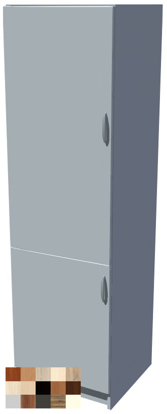 60 cm široká skříňka je na pevném soklu vysokém 10 cm. Celková výška i se soklem je 206 cm. Hloubka korpusu je 46 cm a i čely šuplíků nepřesáhne celková hloubka skříňky 58 cm. Za skříňkou již není žádný prostor pro vedení vody, plynu, elektrické zásuvky apod.