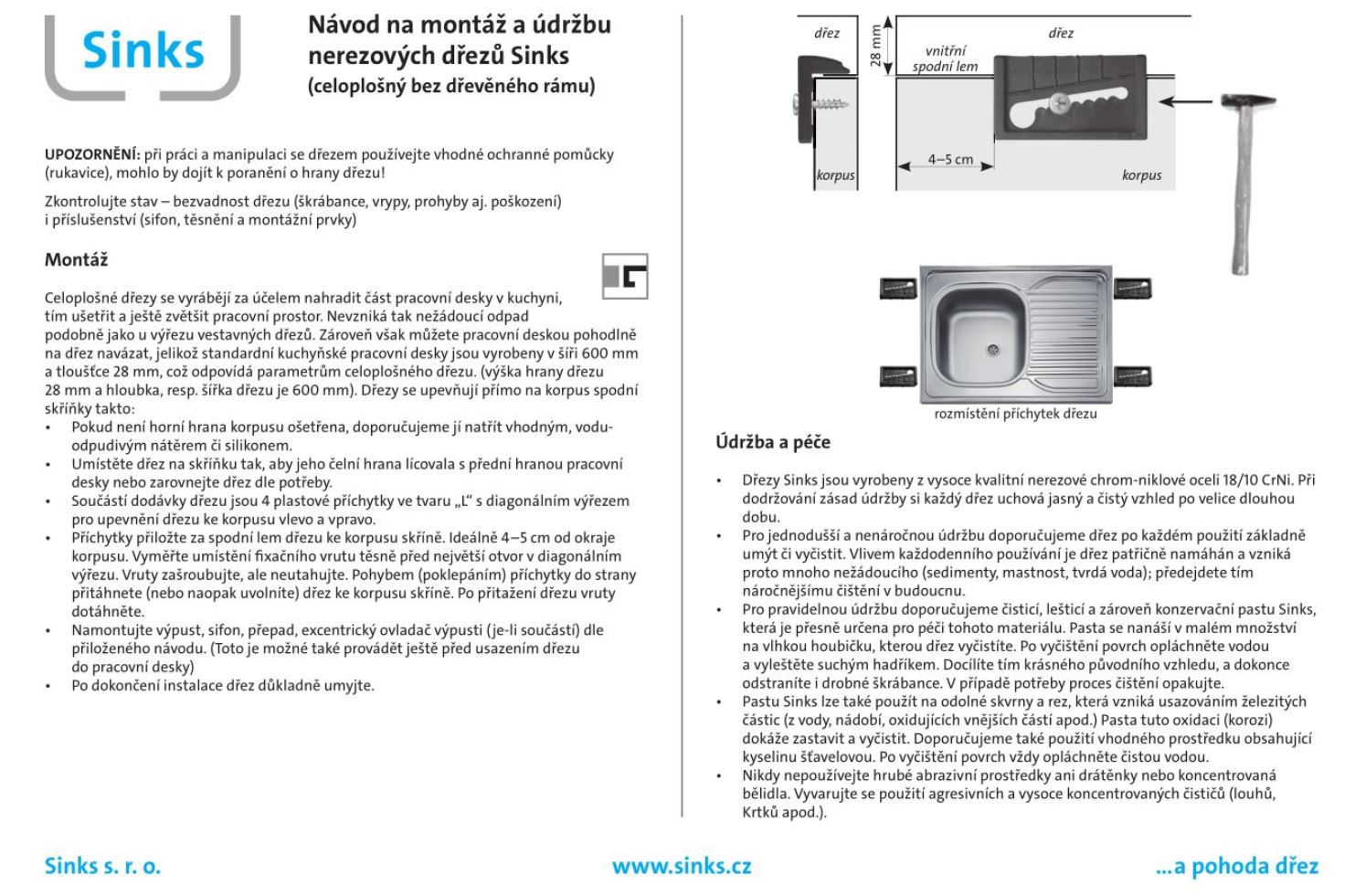 - Oboustranného nerezového celoplošného dřezu včetně sifonu a montážních úchytek
