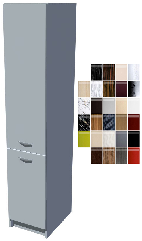 40 cm široká skříňka je na pevném soklu vysokém 10 cm. Celková výška i se soklem je 206 cm. Hloubka skříňky je 58 cm. Za skříňkou tedy již není žádný prostor pro vedení vody, plynu nebo pro elektrické zásuvky apod. V dolní části je jedna a v horní části jsou dvě volné police.