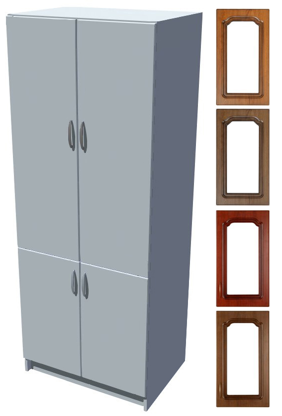 80 cm široká skříňka je dvojdveřová a na pevném soklu vysokém 10 cm. Celková výška i se soklem je 206 cm. Hloubka korpusu je 56 cm a i s dvířky nepřesáhne celková hloubka skříňky 58 cm. Za skříňkou již není žádný prostor pro elektrické zásuvky, vedení vody, plynu apod. Ve spodní části je jedna volná police, v horní dvě.