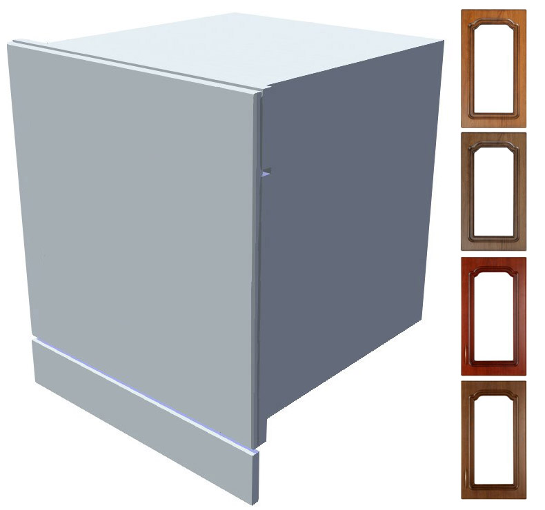 Vestavná myčka nemá žádnou vlastní skříňku. Umístí se v kuchyňské lince mezi ostatní skříňky a pouze zepředu se na čelo myčky přišroubují námi vyrobená dvířka. Dvířka jsou potom v barvě jako dvířka ostatních skříněk v lince. Myčku kryje ještě zepředu dolní sokl, který přidáváme k objednávce zdarma. Barvu soklu určuje barva korpusů skříněk z objednávky. Případně barvu připište do poznámky k objednávce. Také si můžete objednat plastový sokl.