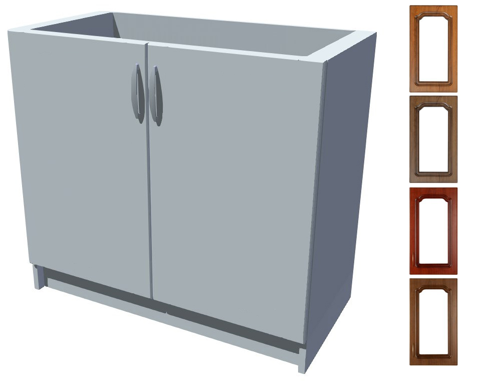 90 cm široká skříňka je dvojdveřová a na pevném soklu vysokém 10 cm. Celková výška i se soklem je 82 cm. Hloubka korpusu je 50 cm a i s dvířky nepřesáhne celková hloubka skříňky 52 cm. Díky tomu za skříňkou vzniká prostor cca 11 cm pro vedení vody, plynu, zásuvek apod. Uvnitř skříňky je jedna police. Vršek skříňky je otevřený a jsou zde umístěny jen příčky k uchycení pracovní desky.