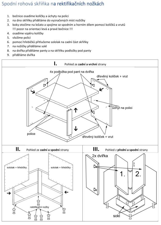 - Většina skříněk je již smontovaná. Při instalaci kuchyně musíte připevnit pouze nožičky, úchytky a sokl.