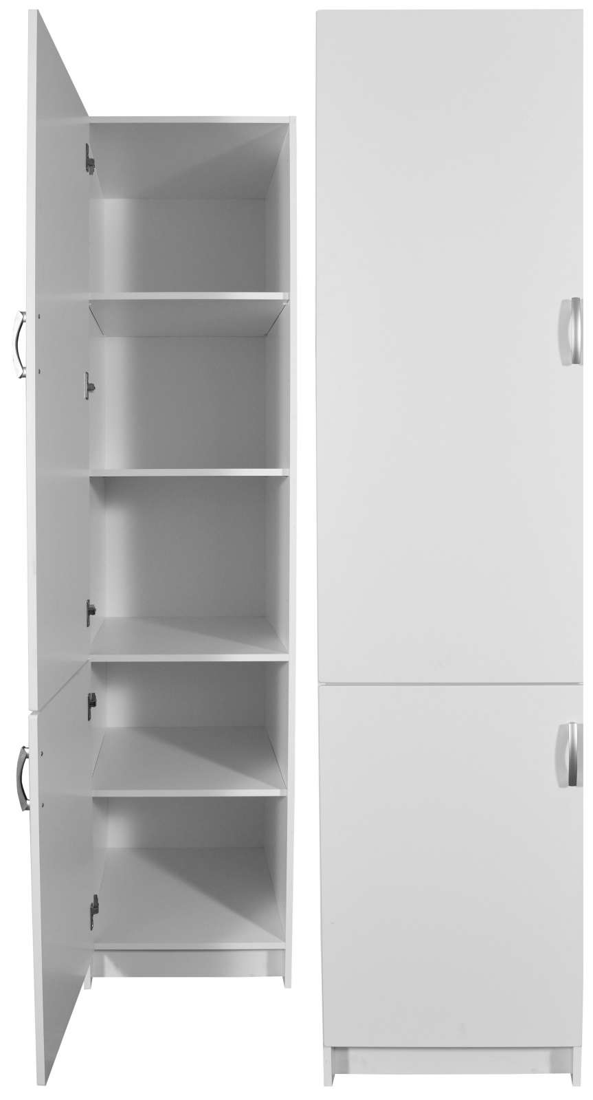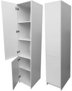 Potravinová skříň do kuchyně má včetně pevného soklu (10cm) výšku 206 cm. Hloubka korpusu je 56 cm a i s dvířky nepřesáhne celková hloubka skříňky 58 cm. Díky tomu není za skříňkou žádný prostor pro vedení vody, plynu apod.. Skříň je s jednodveřovým otvíráním a celkem má pět pater polic jako úložný prostor. K dvířkům je zdarma úchytka Diana. Tvar dvířek je rovný-hladký, barva dvířek a korpusu je bílá.