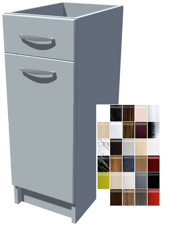 Dvířka jsou z lesklé MDF, tedy fólie na dřevovláknité desce. Povrch dvířek, kromě vzhledu a možnostem výběru, vyniká také dlouhou životností a snadnou údržbou. Korpus skříňky je vyrobený z laminované dřevotřískové desky a má hrany z ABS, které ho chrání před vlhkostí a mechanickým poškozením.