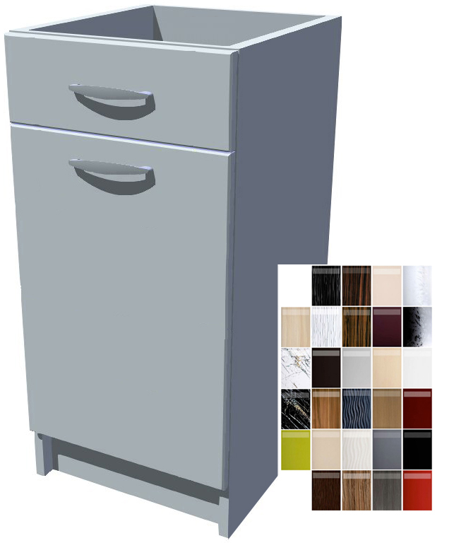 Dvířka jsou z lesklé MDF, tedy fólie na dřevovláknité desce. Povrch dvířek, kromě vzhledu a možnostem výběru, vyniká také dlouhou životností a snadnou údržbou. Korpus skříňky je vyrobený z laminované dřevotřískové desky a má hrany z ABS, které ho chrání před vlhkostí a mechanickým poškozením.