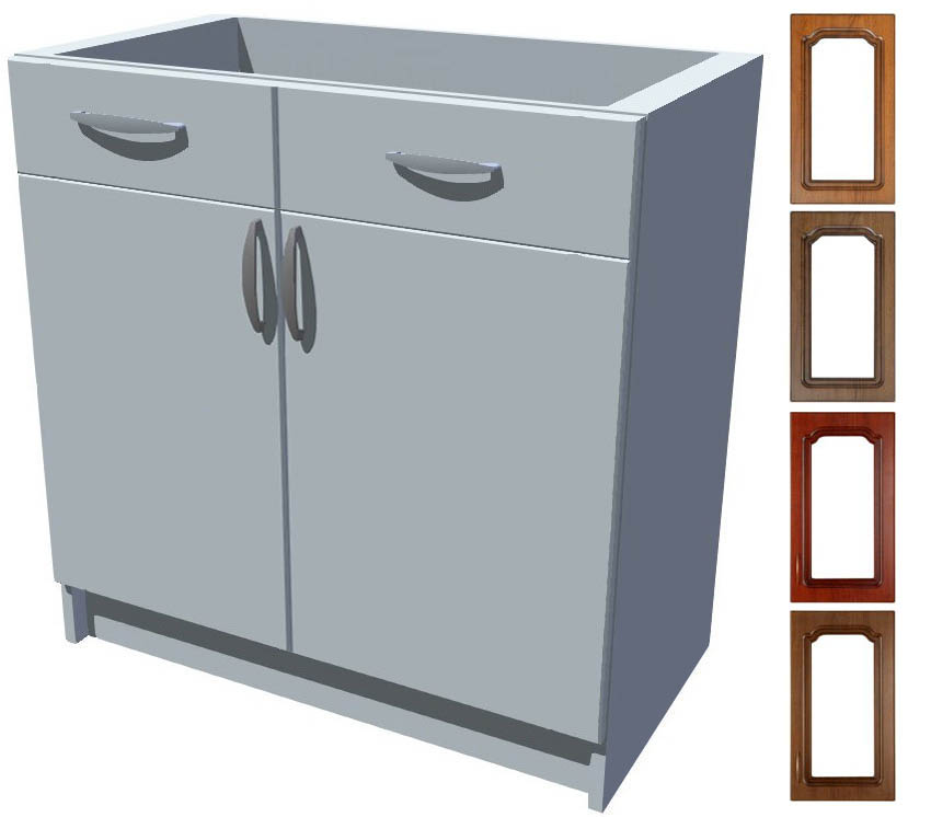 80 cm široká skříňka je jednodveřová a na pevném soklu vysokém 10 cm. Celková výška i se soklem je 82 cm. Hloubka korpusu je 50 cm a i s dvířky nepřesáhne celková hloubka skříňky 52 cm. Díky tomu za skříňkou vzniká prostor cca 11 cm pro vedení vody, plynu, zásuvek apod. Uvnitř skříňky je jedna police. Vršek skříňky je otevřený a jsou zde umístěny jen příčky k uchycení pracovní desky.