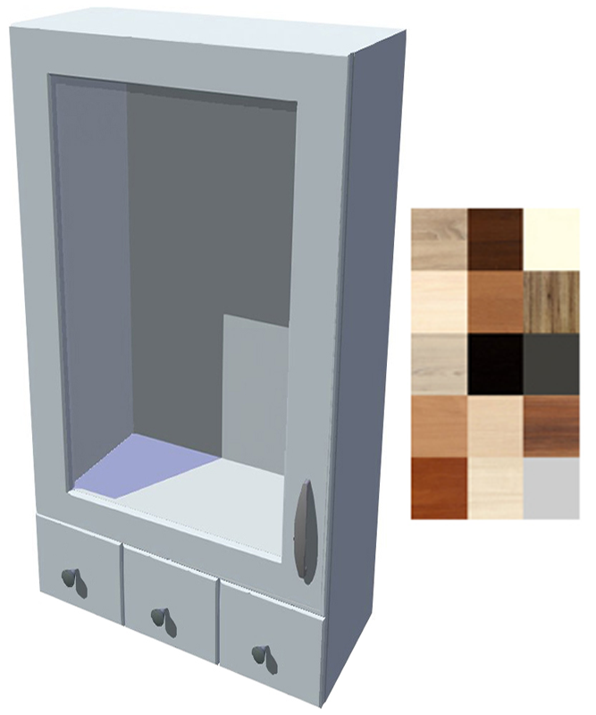 Skříňku skládájící se z dvířek a těla (korpusu) dodávám již smontovanou. Před vložením zboží do košíku zvolte v nabídce pod tímto textem typ skla, barvu dvířek a korpusu, typ skla a stranu otvírání. Barvy dvířek a korpusů se dají kombinovat. Dvířka jsou předvrtaná pro úchytku Diana s roztečí 96 mm, která je zdarma a nebo si vyberte jinou ZDE.