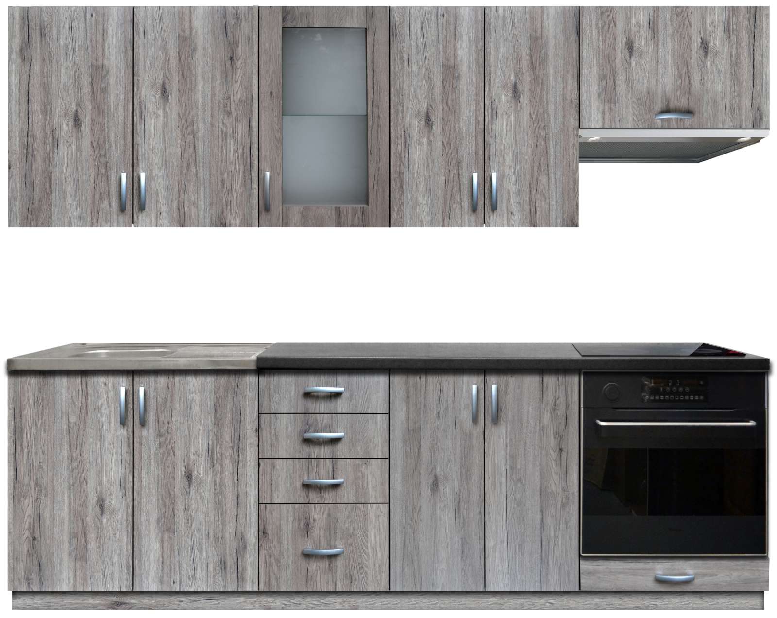 Kvalitní, pevně smontovaná kuchyňská linka v barvě tmavého sanremo. Šířka 240 cm, výška 206 cm, hloubka 60 cm.