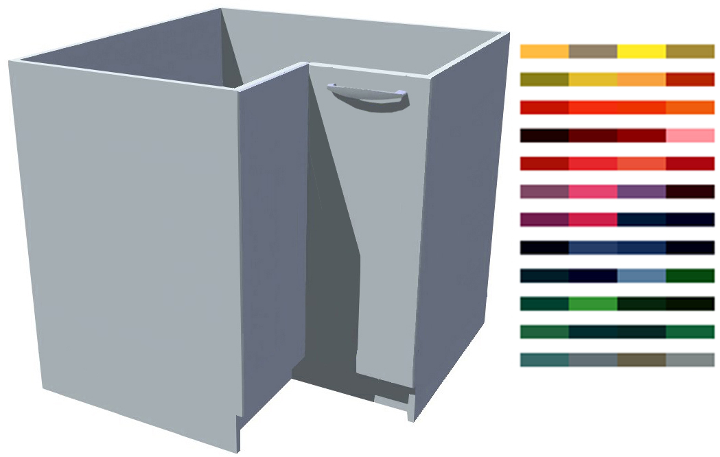 Šířka 90 x 90 cm, výška 82 cm, hloubka 52 cm. Výběr barvy dvířek, korpusu a strany otvírání.