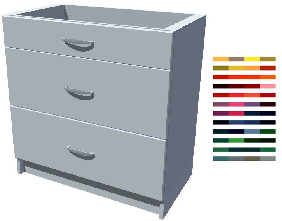 Šířka 50 cm, výška 82 cm, hloubka 52 cm. Výběr barvy dvířek, korpusu a dovírací mechaniky zásuvek..