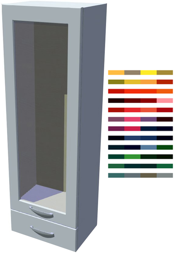 Šířka 40 cm, výška 72 cm, hloubka 32 cm. Výběr barvy dvířek, korpusu, strany otvírání a skla.