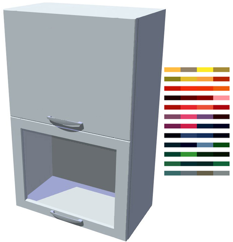 Šířka 50 cm, výška 40 cm, hloubka 32 cm. Výběr barvy dvířek, korpusu a typ skla a výklopné mechaniky.
