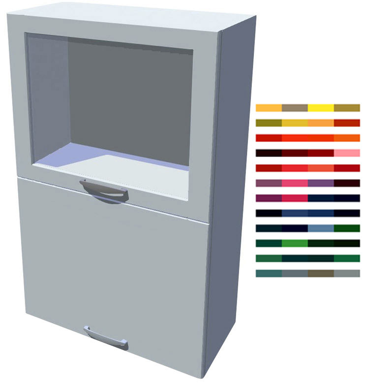 Šířka 60 cm, výška 40 cm, hloubka 32 cm. Výběr barvy dvířek, korpusu, typ skla a výklopné mechaniky.