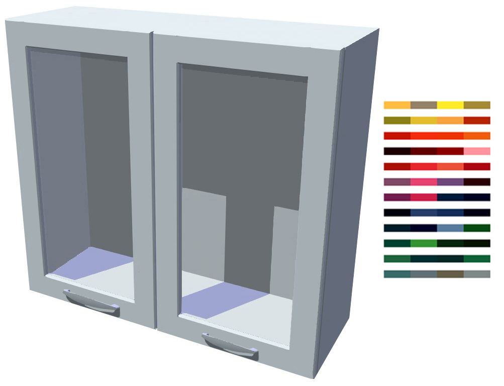 Šířka 80 cm, výška 40 cm, hloubka 32 cm. Výběr barvy dvířek, korpusu a typ skla a výklopné mechaniky.