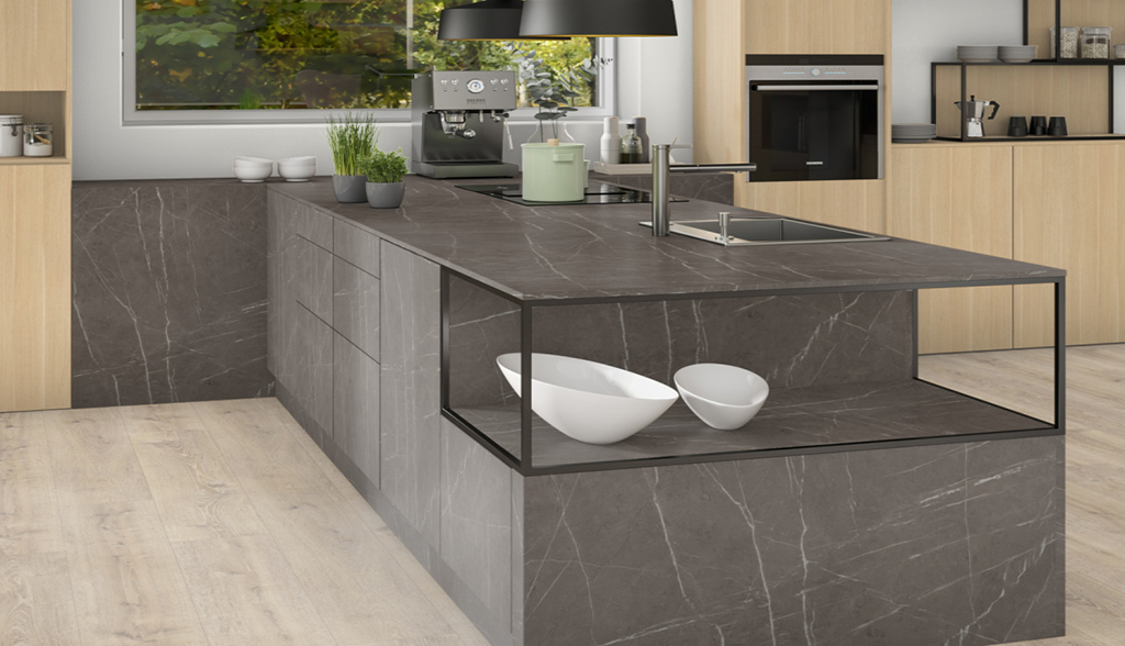 Barva a charakter: dekor Pietra Grigia antracitová má mírně teplejší, tmavě šedý barevný odstín, který může představovat atraktivní kontrast k různým druhům bílého dřeva. Vypadá velmi elegantně a hodnotně v kombinaci tón v tónu s dřevodekory, jako je například ořech. Tento mramor vypadá rovněž velmi autenticky na velkých plochách, protože má díky formátu XL méně opakování. Povrchová struktura ST9 Smoothtouch Matt vyvolává sladěný, chladně matný pocit.