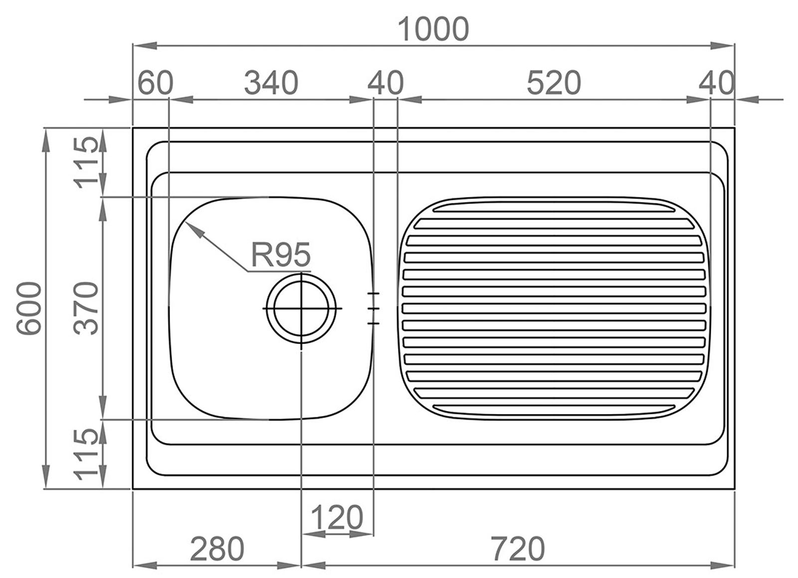 Dřez celoplošný 80x60 cm, nerez o síle plechu 0,5 mm.