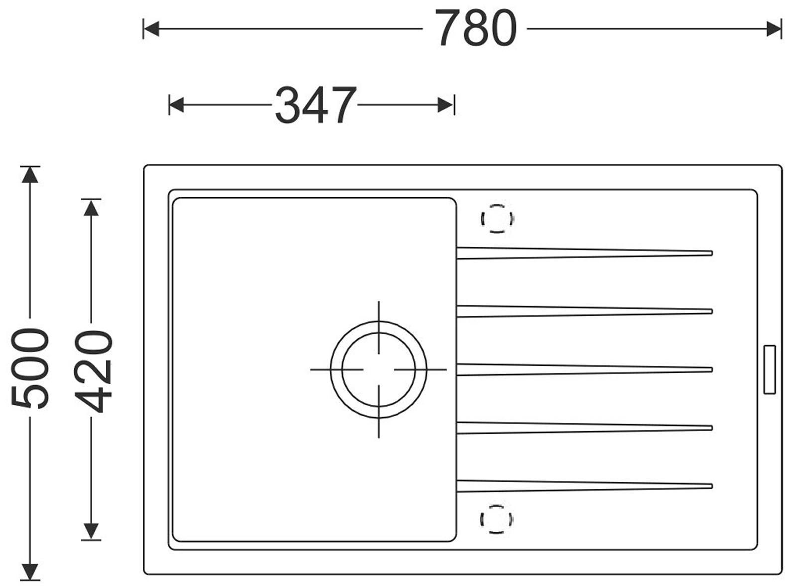 Dřez je určen pro horní i spodní montáž do pracovní desky a minimálně 450 mm široké skříňky. Pro spodní montáž (do kamenné desky) je nutné přikoupit speciální montážní sadu.