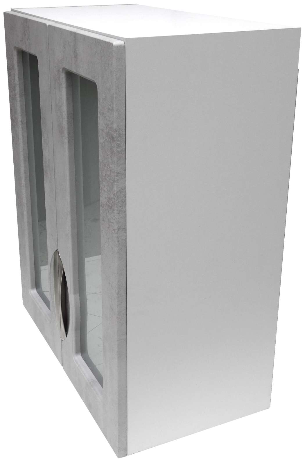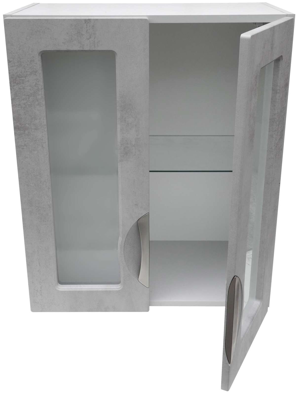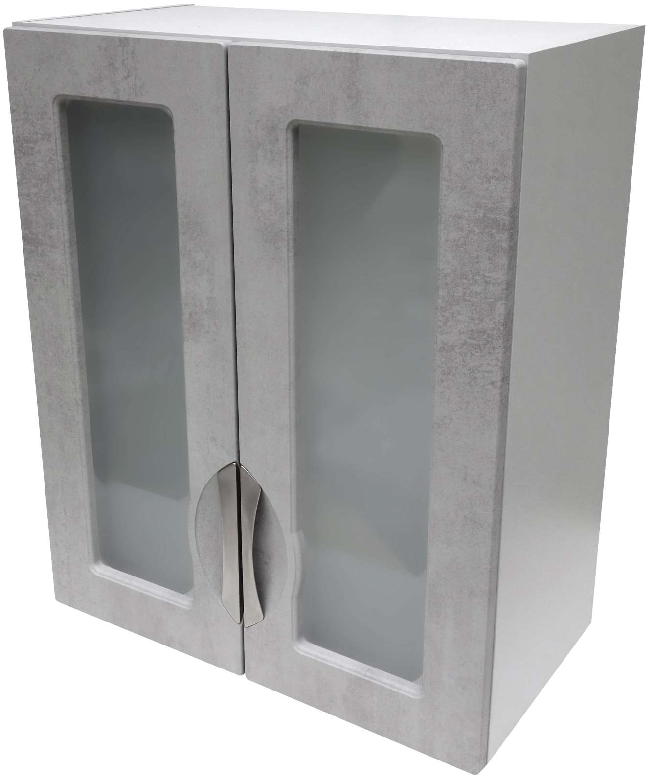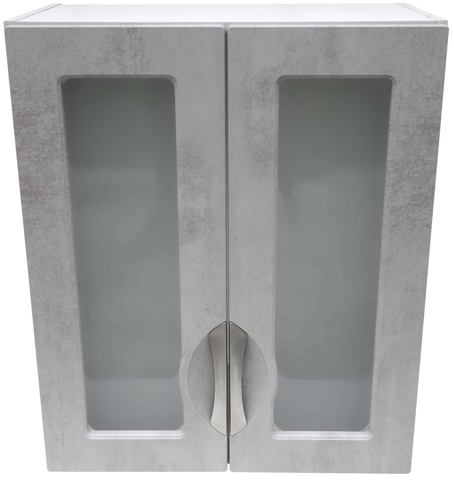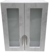 Prosklená kuchyňská skříňka v moderním designu: dvířka v barvě beton, korpus šedý. Kuchyňská skříňka se zafrézovanými kovovými úchyty zdarma dorazí do vašeho domova pečlivě zabalená a pevně smontovaná - tak jak ji vidíte na obrázku, včetně závěsného systému, kterým se uchytí na závěsnou lištu - tu si můžete přiobjednat ve variantách zboží.