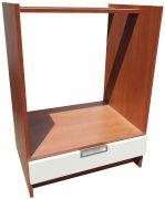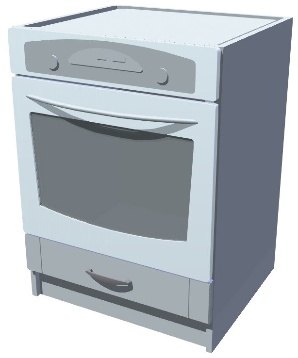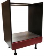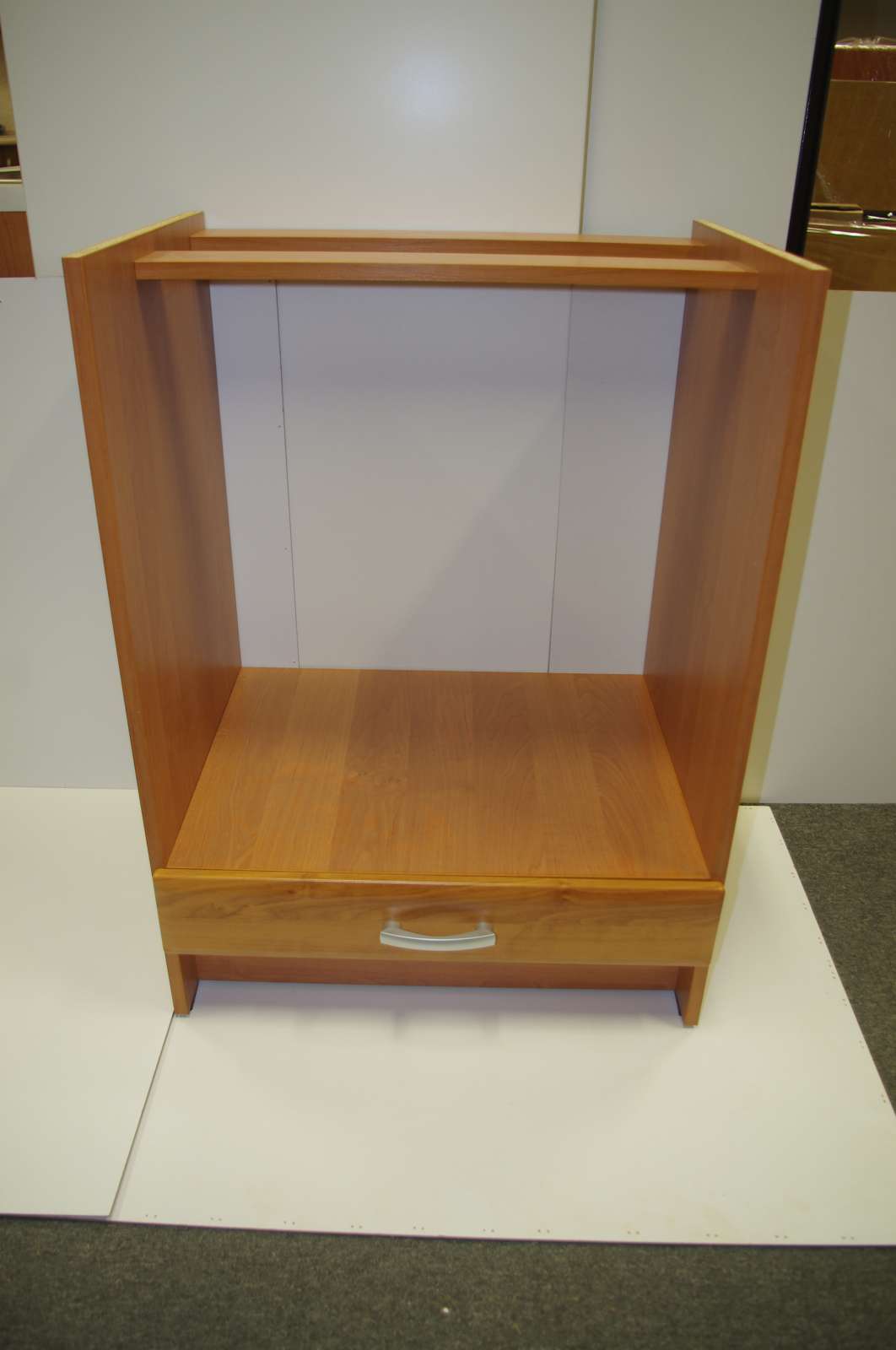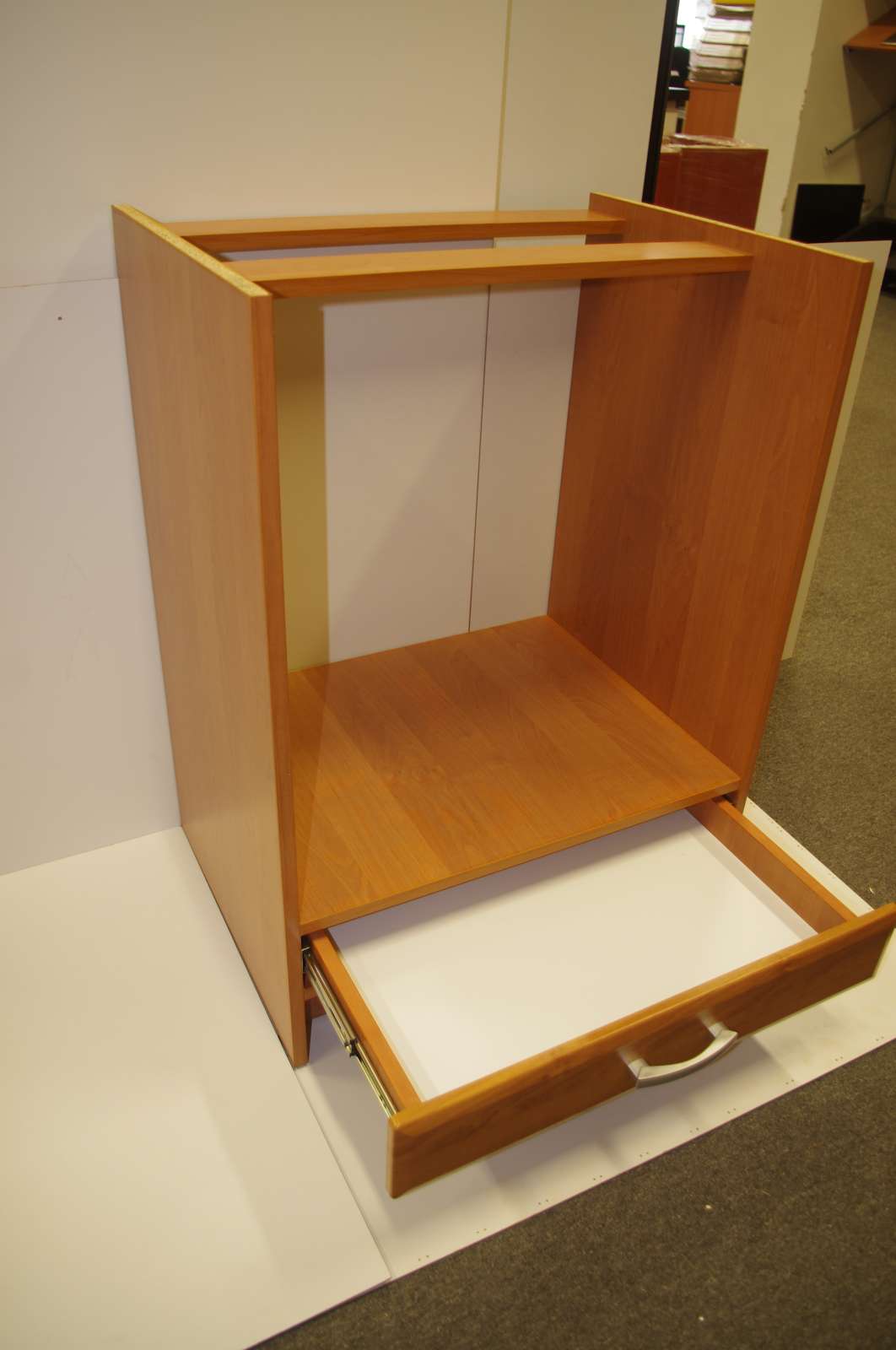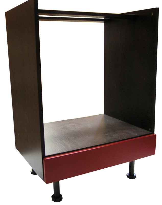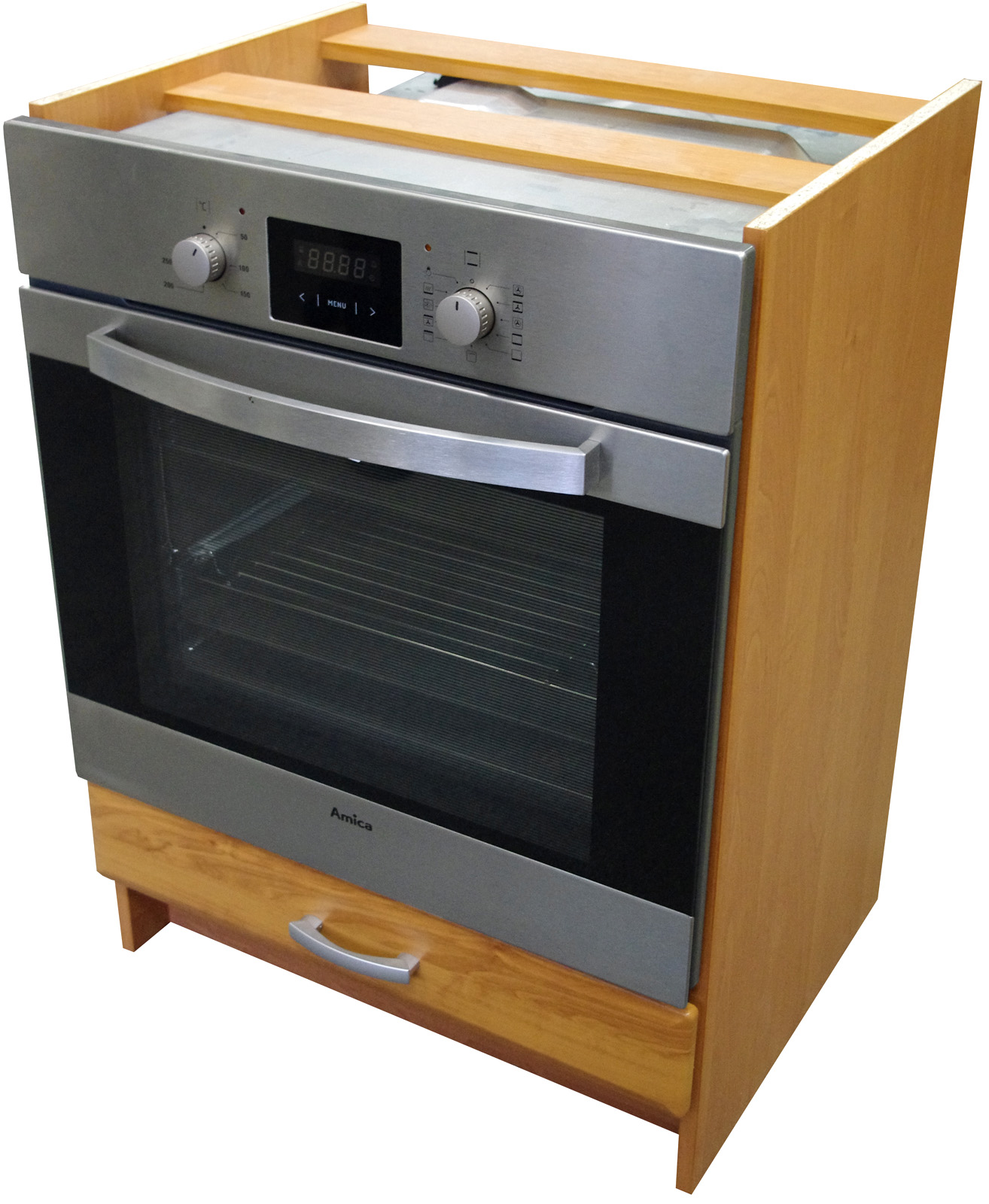 60 cm široká skříňka je na pevném soklu vysokém 10 cm. Celková výška i se soklem je 82 cm. Hloubka korpusu je 50 cm a i s dvířky nepřesáhne celková hloubka skříňky 52 cm. Díky vestavné troubě však za skříňkou již není žádný prostor pro vedení vody, plynu, elektrické zásuvky apod. V dolní části je jeden šuplík vhodný na umístění pekáčů. Horní příčky skříňky jsou jen přepravní a před instalací trouby je nutné je odstranit.