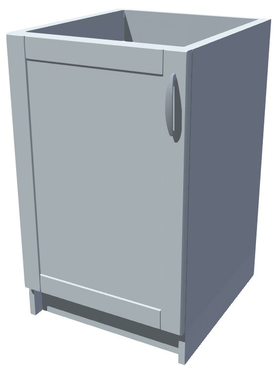 50 cm široká skříňka je jednodveřová a na pevném soklu vysokém 10 cm. Celková výška i se soklem je 82 cm. Hloubka korpusu je 50 cm a i s dvířky nepřesáhne celková hloubka skříňky 52 cm. Díky tomu za skříňkou vzniká prostor cca 6 cm pro vedení vody, plynu, zásuvek apod. Skříňka je bez police.