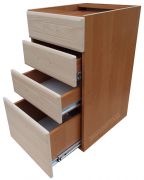 Pojezdy šuplíku jsou ložiskové kovové plnovýsuvy. Můžete si však zvolit luxusní pojezdy s tlumením. V tomto případě jsou skříňky hlubší! Skříňky vybavené systémem pojezdů Blum TANDEMBOX nebo systémem GTV jsou hluboké 54 cm.