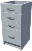 40 cm široká skříňka je na pevném soklu vysokém 10 cm. Celková výška i se soklem je 82 cm. Hloubka korpusu je 50 cm a i s dvířky nepřesáhne celková hloubka skříňky 52 cm. Díky tomu za skříňkou vzniká prostor cca 6 cm pro vedení vody, plynu, zásuvek apod. V případě varianty s luxusními pojezdy je hloubka skříňky 54 cm a mezera je pouze 4 cm. Vršek skříňky je otevřený a jsou zde umístěny jen příčky k uchycení pracovní desky.