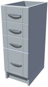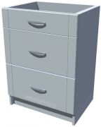 60 cm široká skříňka je na pevném soklu vysokém 10 cm. Celková výška i se soklem je 82 cm. Hloubka korpusu je 50 cm a i s dvířky nepřesáhne celková hloubka skříňky 52 cm. Díky tomu za skříňkou vzniká prostor cca 6 cm pro vedení vody, plynu, zásuvek apod. V případě varianty s luxusními pojezdy je hloubka skříňky 54 cm a mezera je pouze 4 cm. Vršek skříňky je otevřený a jsou zde umístěny jen příčky k uchycení pracovní desky.