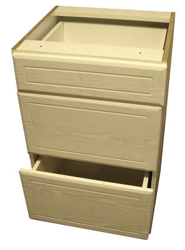 Čela šuplíků jsou z matné MDF, tedy fólie na dřevovláknité desce. Povrch dvířek, kromě vzhledu a možnostem výběru, vyniká také dlouhou životností a snadnou údržbou. Korpus skříňky je vyrobený z laminované dřevotřískové desky a má hrany z ABS, které ho chrání před vlhkostí a mechanickým poškozením.