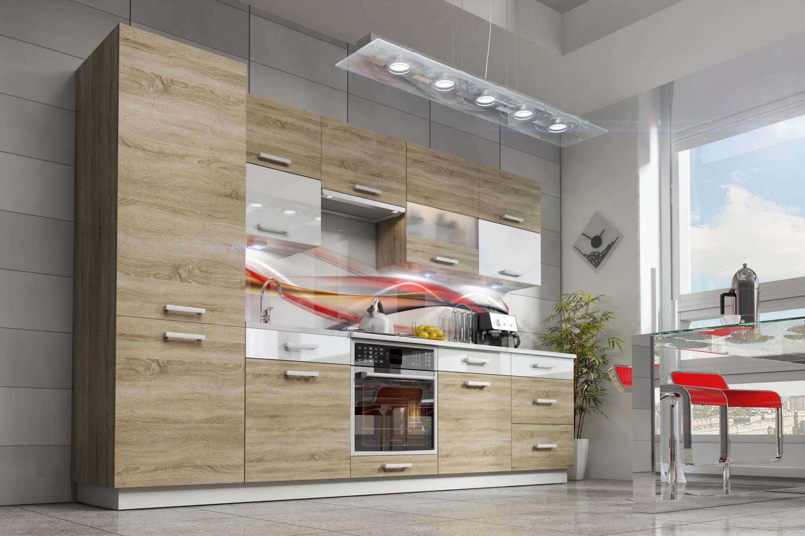 Korpus i dvířka se vyrábějí z LTD, tedy laminované dřevotřísky tloušťky 16 mm chráněné hranou ABS. Vybírat lze z barevných vzorů Sanremo Tmavé, Cypřiš a Dub Sonoma. Horní čelo šuplíků a spodní dvířka výklopů jsou z lesklých barev Bílá, Černá, Grafit a Latté. Moderní vzhled za rozumnou cenu.